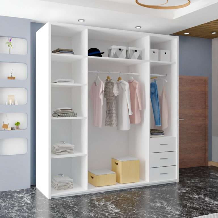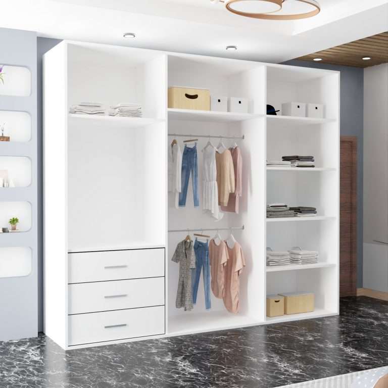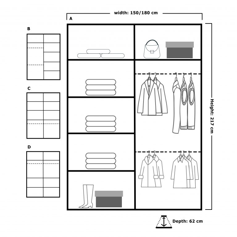 Discusses the flexibility offered to customers in tailoring the wardrobe to their preferences. Illustrates how customers can adjust shelves and hanging rails to suit their organizational needs.