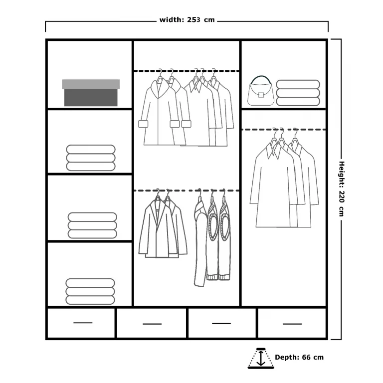 If you want a variety in sizes of this wardrobe, no need to worry at all. Because we?ve got your back and come up with a variety in sizes as 203cm and 253cm.